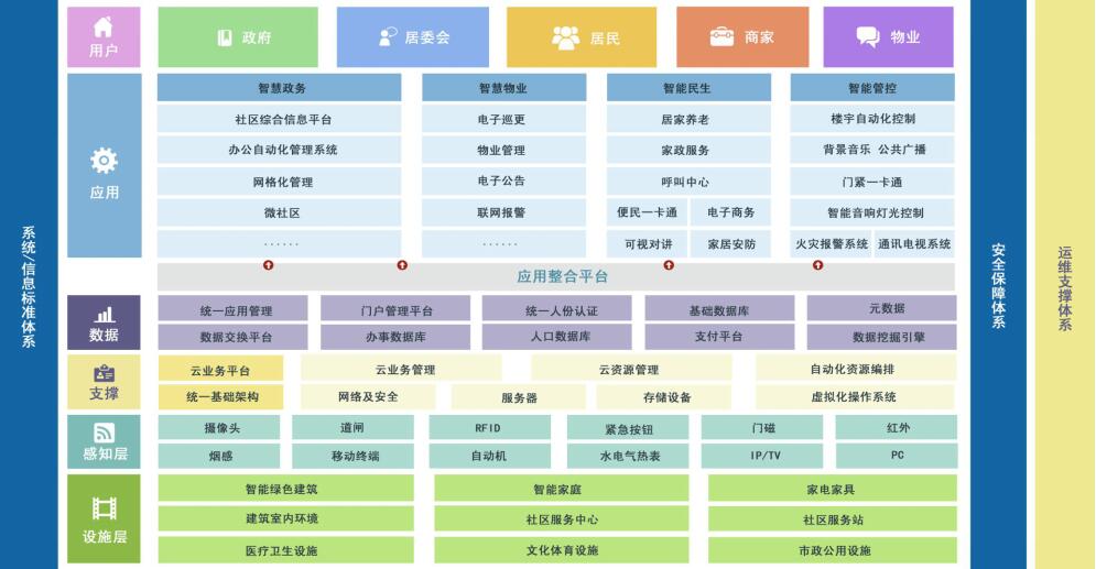 智慧社區(qū)項(xiàng)目從業(yè)務(wù)需求及基本現(xiàn)狀來講,都要考慮實(shí)際的應(yīng)用和未來發(fā)展,既能滿足目前業(yè)務(wù)需要,又能適應(yīng)未來技術(shù)的發(fā)展的需求。因此,在項(xiàng)目的頂層設(shè)計(jì)中,除了保證系統(tǒng)建設(shè)的安全性、實(shí)用性、拓展性等,還要遵循集中管控、分散管理的建設(shè)原則,堅(jiān)守智慧社區(qū)的建設(shè)特色。所謂的集中管控是指:項(xiàng)目遵循“一體化”的原則進(jìn)行設(shè)計(jì),采用一個(gè)統(tǒng)一的數(shù)據(jù)平臺(tái)、統(tǒng)一的管理使用平臺(tái)、統(tǒng)一的終端基礎(chǔ)軟硬件平臺(tái)、統(tǒng)一的卡片規(guī)劃平臺(tái),這樣街道辦事處在總體項(xiàng)目上投資小、售后服務(wù)成本低、升級(jí)容易、管理簡單。更為重要的是一體化的架構(gòu)使得系統(tǒng)平臺(tái)結(jié)構(gòu)關(guān)系變?yōu)楹唵危鱾€(gè)應(yīng)用子系統(tǒng)可以在同一個(gè)平臺(tái)上進(jìn)行操作,降低了應(yīng)用系統(tǒng)的擴(kuò)展和實(shí)施的難度。所謂的分散管理是指:完全支持一個(gè)街道辦事處、多個(gè)社區(qū),一個(gè)服務(wù)端、多個(gè)終端,一個(gè)平臺(tái)、多個(gè)用戶的管理模式,讓管理不再受地域和空間限制。